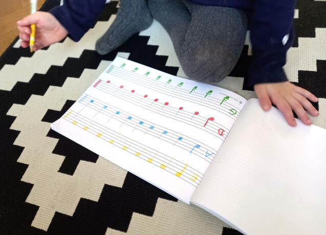 We learn how to write notes in the stave and in the same time, we memorize the color of the strings!